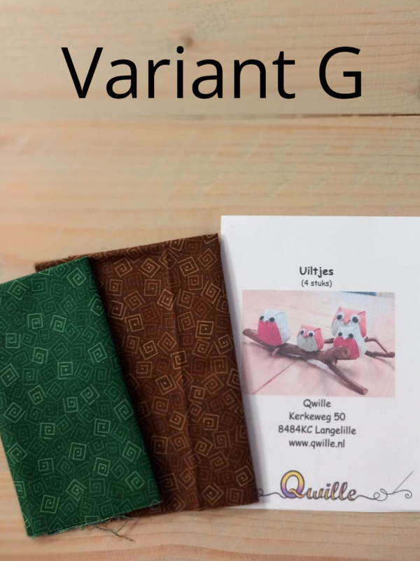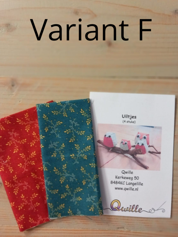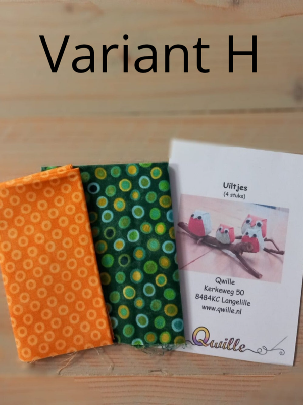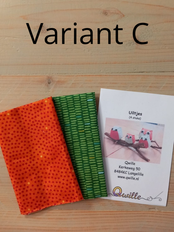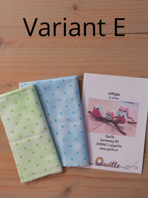 Een pakket met stof, toebehoren en een duidelijke omschrijving om deze leuke uiltjes zelf te kunnen maken. Vier uiltjes van verschillende formaten. Ook erg leuk om samen met kinderen te maken!