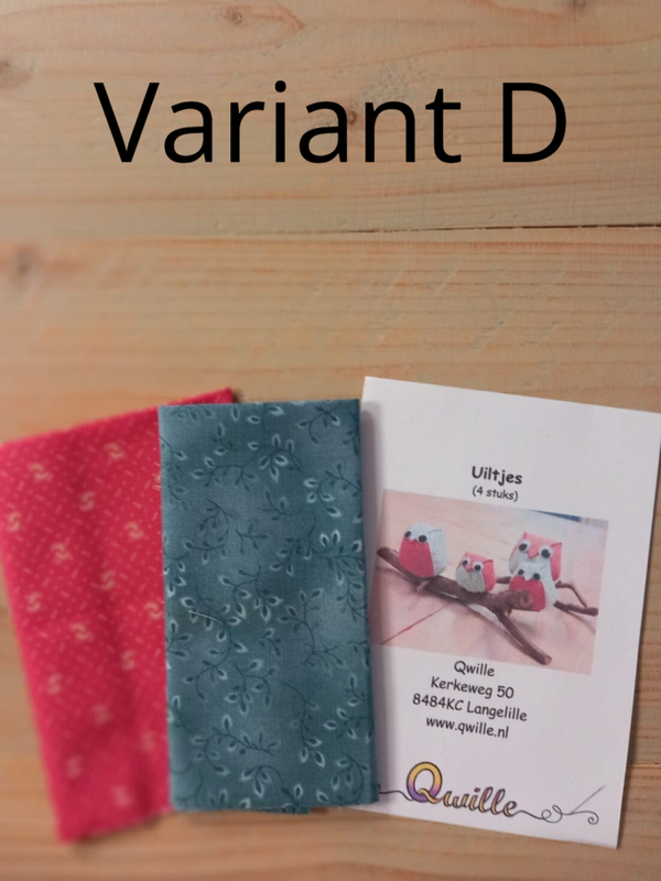 Uitleg kant-en-klaar pakket: in de foto's zie je de verschillende kleur/stoffen-combinaties die beschikbaar zijn voor dit pakket. Bij Variant kun je kiezen voor de overeenkomstige letter zodat je het juiste pakket ontvangt.