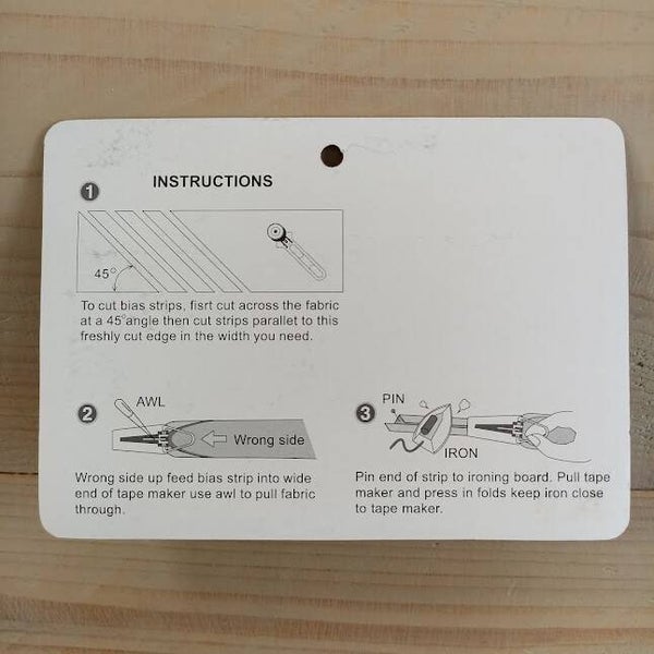 Voer een strook stof aan de brede kant in de tapemaker en strijk hem meteen op het moment dat hij er aan de smalle kant weer uitkomt. Zo kun je een bies maken van elke gewenste stof.