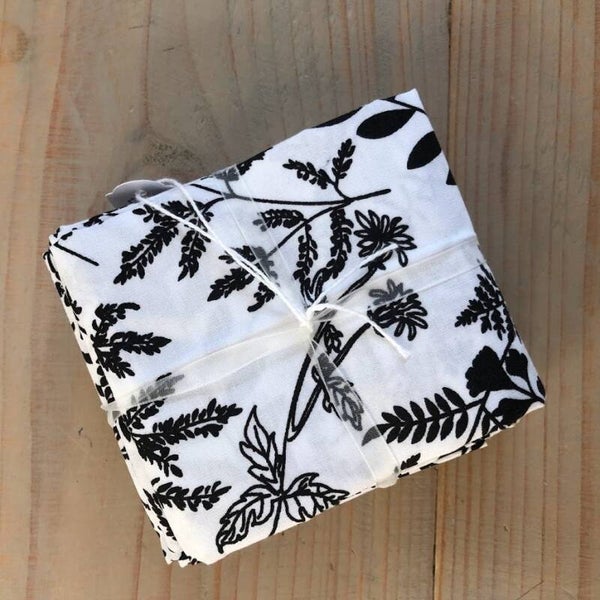 Drie zwart-wit stoffen in een leuke bundel. Dit zijn Amerikaanse fat quarters, wat betekent dat de afmeting 45 x 55 cm is.