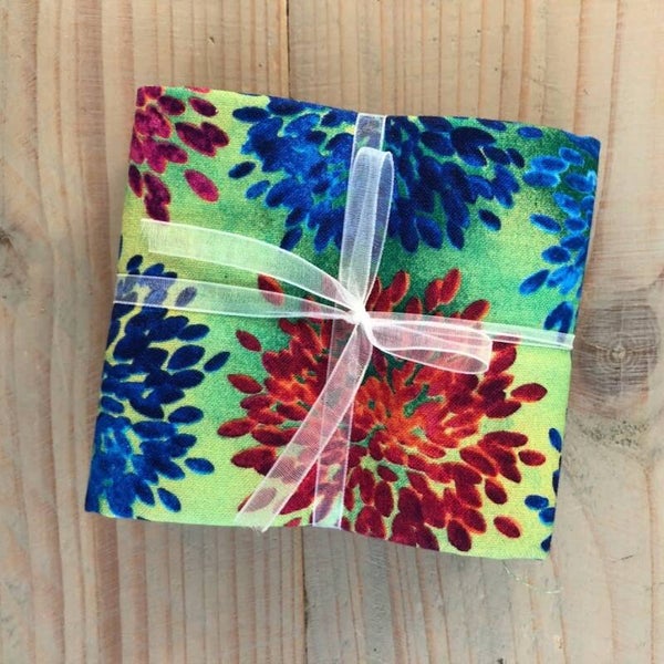 Deze bundel bevat drie fat quarters; één paarse effen stof, een groene stof met kleine stipjes en een lichtgroen met blauwe en rode bloemen.