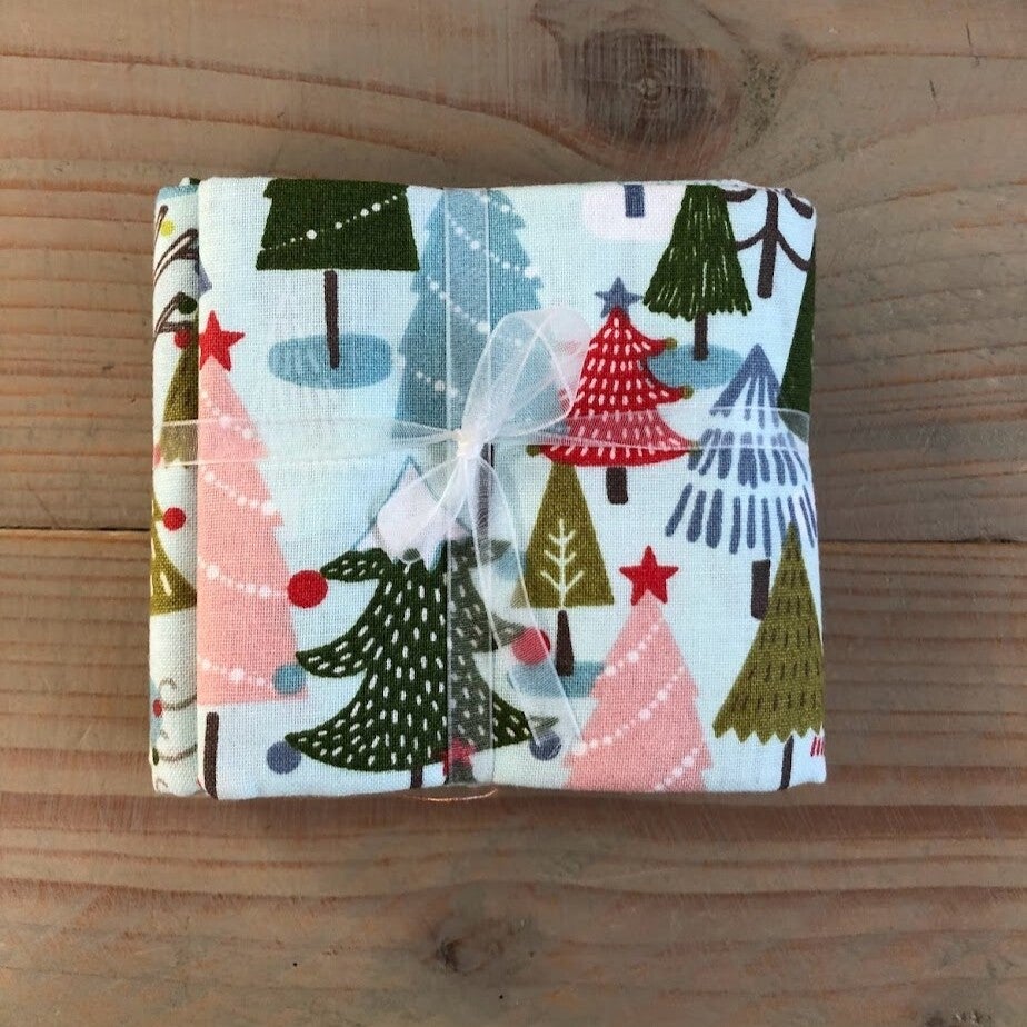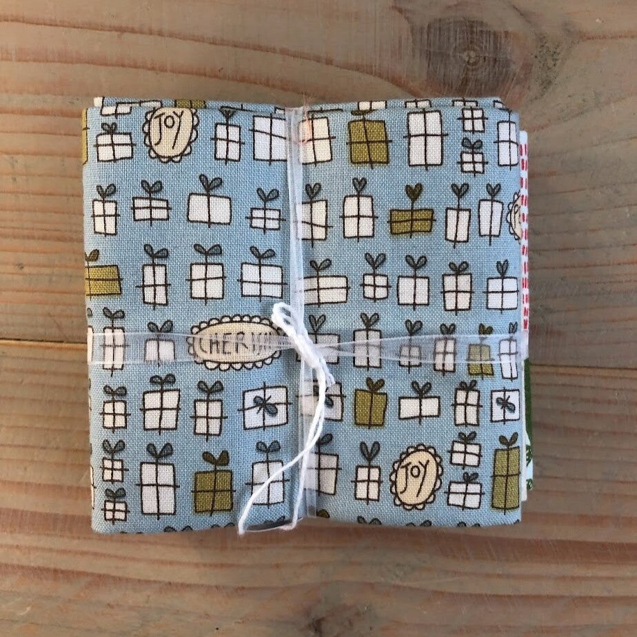 Bundel van drie fat quarters met Kerst dessin. Leuke moderne dessins in een wat minder traditionele Kerstkleur, blauw.