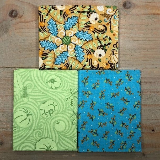 Een leuke fat quarter in het thema herfst; pompoenen en blaadjes in oranje, blauw, bruin en groen. En daarbij een lichtgroene stof met een vergelijkbaar motief en een blauwe stof met takjes.