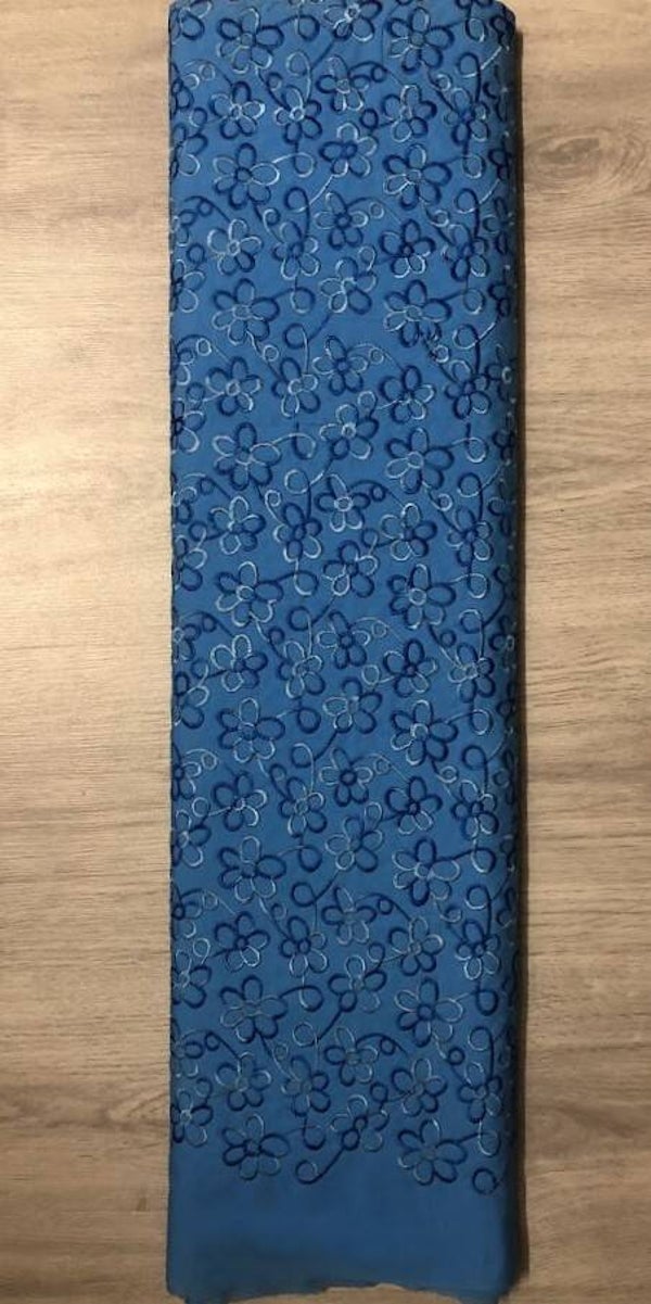 Naaistof Blauw met bloemen - lichtblauwe stof met daarop een in zilver en donkerblauw geborduurde opdruk van bloemen.