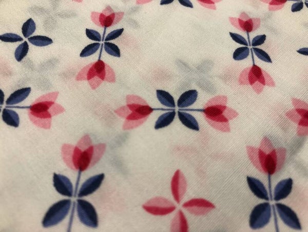 Naaistof Dutch Tulip - een witte katoenen stof met daarop blauw / rode tulpen in ruitvorm.