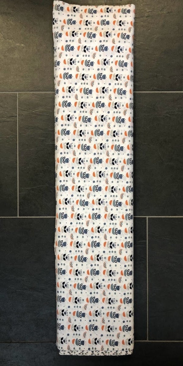 Naaistof Happy Melody Fantasy - witte katoenen stof met blauwe, grijze en oranje figuurtjes.