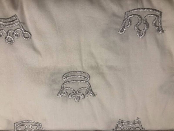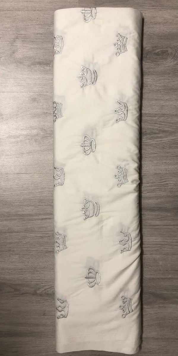 Naaistof Kroontjespracht - een witte stof met daarop geborduurde kroontjes van zilverkleurig garen.
