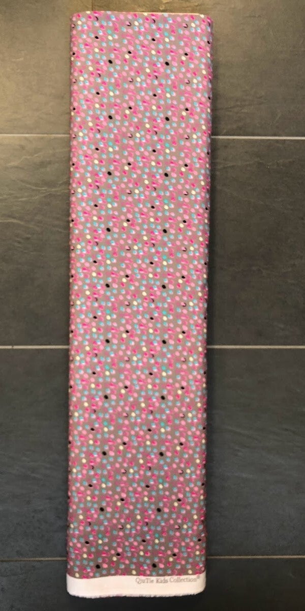 Naaistof Polkadot Parade - een taupe kleur stof met roze, paarse, blauwe en enkele witte en zwarte stippen.