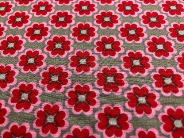 Naaistof Retro Flowers 1 - retro motief van rood / roze bloemetjes op een katoenen naaistof.