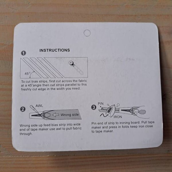 Voer een strook stof aan de brede kant in de tapemaker en strijk hem meteen op het moment dat hij er aan de smalle kant weer uitkomt. Zo kun je een bies maken van elke gewenste stof.