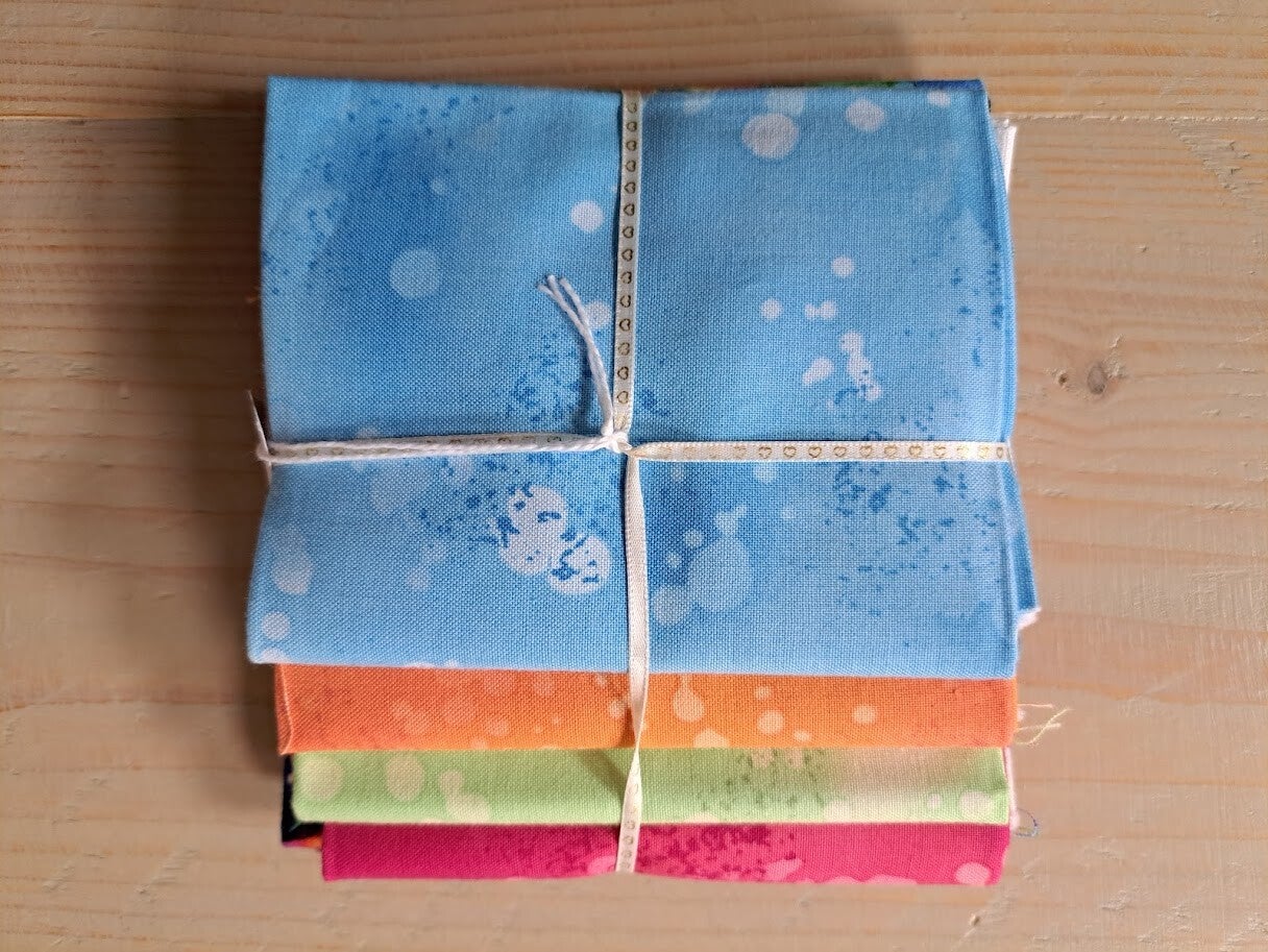 Een grote bundel van 5 fat quarters. Eén stof met felgekleurde bloemen en vier mooie fat quarters in de bijpassende kleuren blauw, oranje, groen en roze.