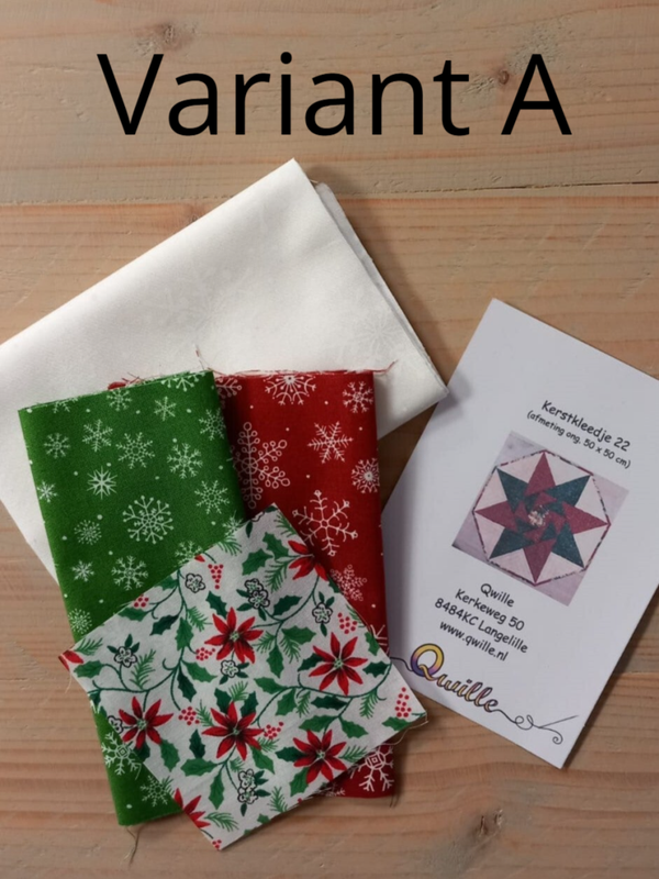 Het leuke Kerstkleedje dat we in 2022 gemaakt hebben bij de quiltcursus. Het pakket bevat de benodigde stof en een uitgebreide omschrijving voor het maken van deze quilt.