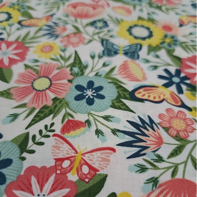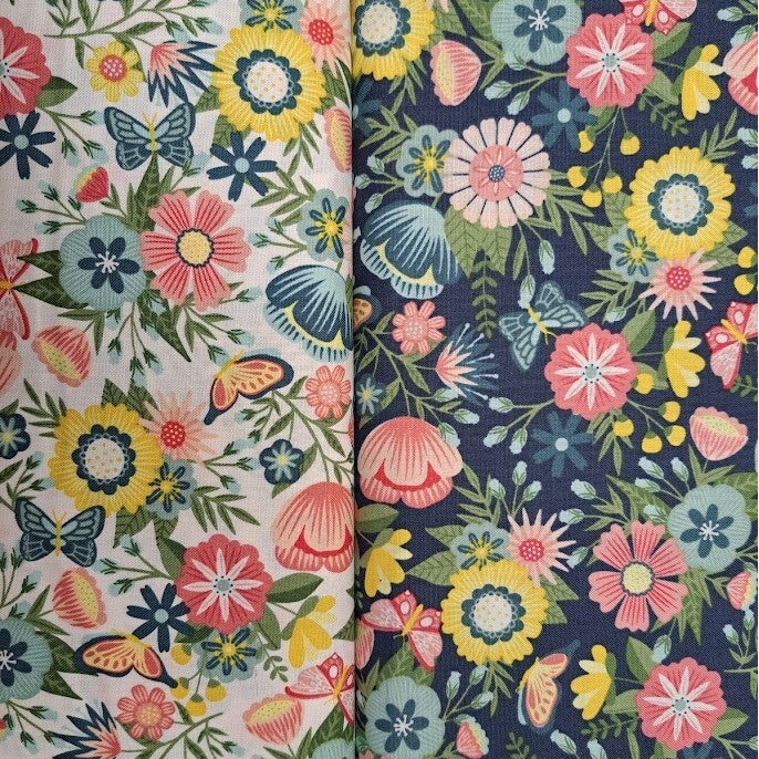 Een fleurige serie quiltstoffen van Maywood Studio in de voornaamste kleuren roze en blauw. De serie bevat twee bloemenstoffen, één met een blauwe achtergrond en één met een witte achtergrond. En daarnaast nog twee meer effen stoffen met een verfijnde getekende lijnopdruk van bloemen. Mooi voor een vrolijke, kleurrijke (bloemen)quilt!