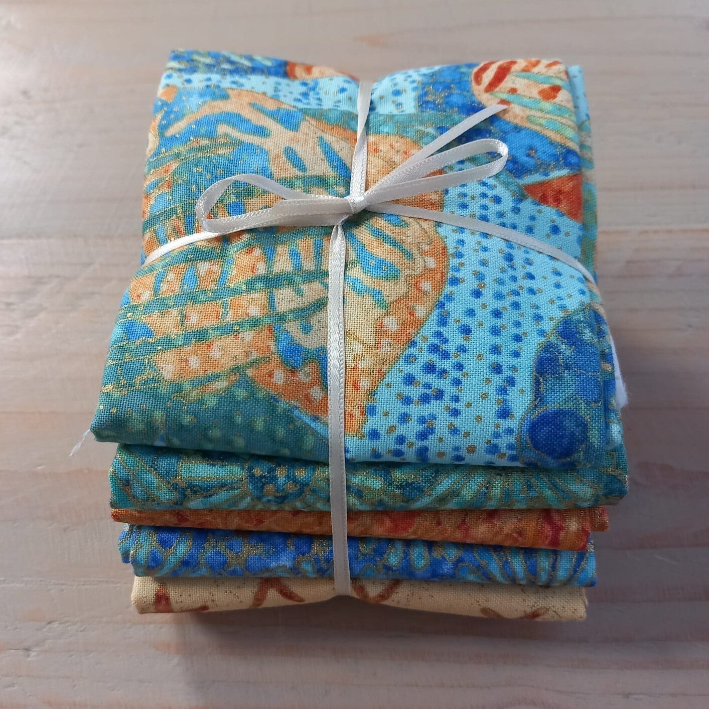 Een bundel met de laatste fat quarters uit de Shimmer Oasis serie. De blauwe stof met vissen is ook nog op rol verkrijgbaar, mocht je nog iets meer van deze stof nodig hebben.