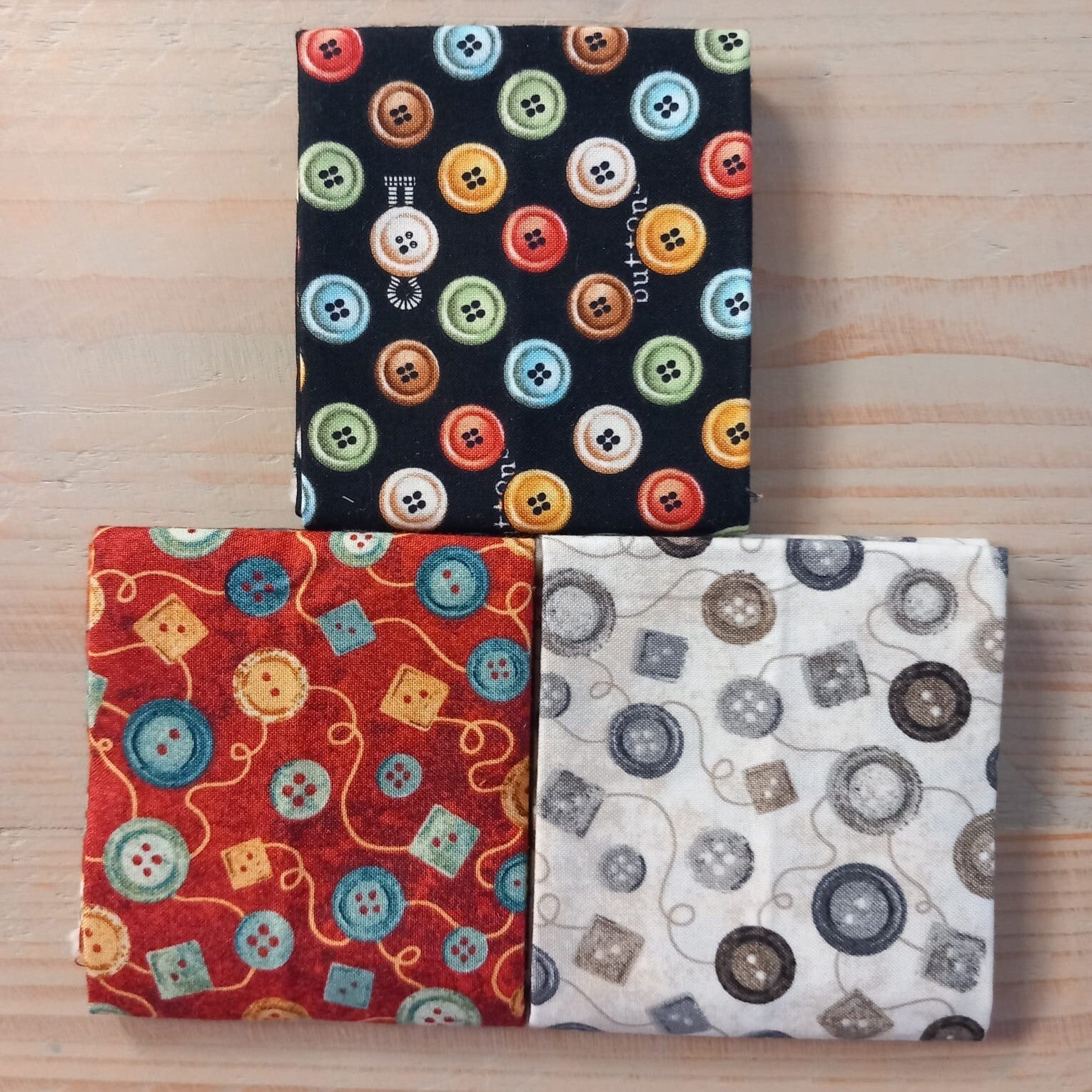 Drie leuke fat quarters met een knoopjes motief. Eén in de kleur zwart, één in de kleur rood en een witte stof.