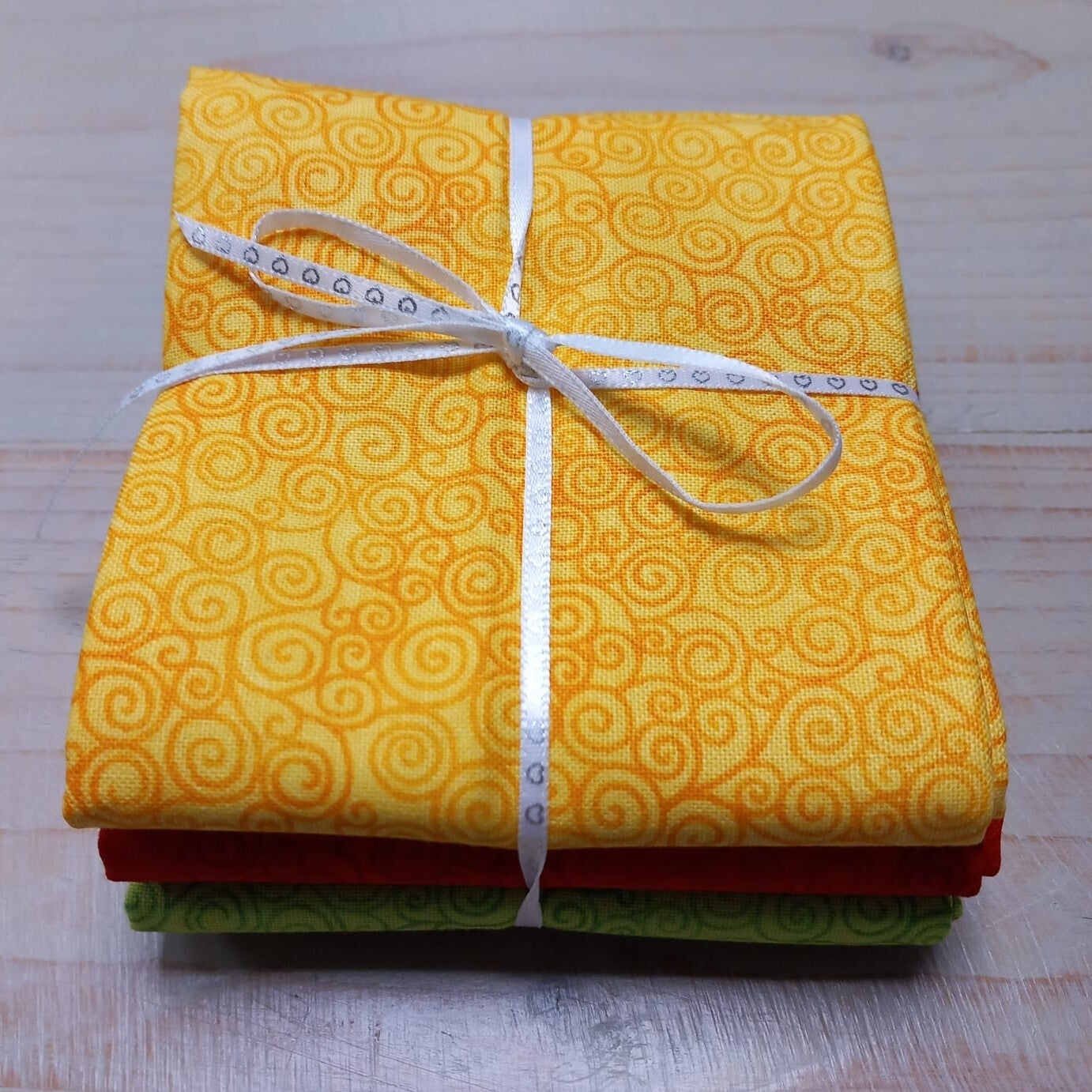 Een kleurrijke fat quarter bundel: rood, geel en groen met een subtiel printje.