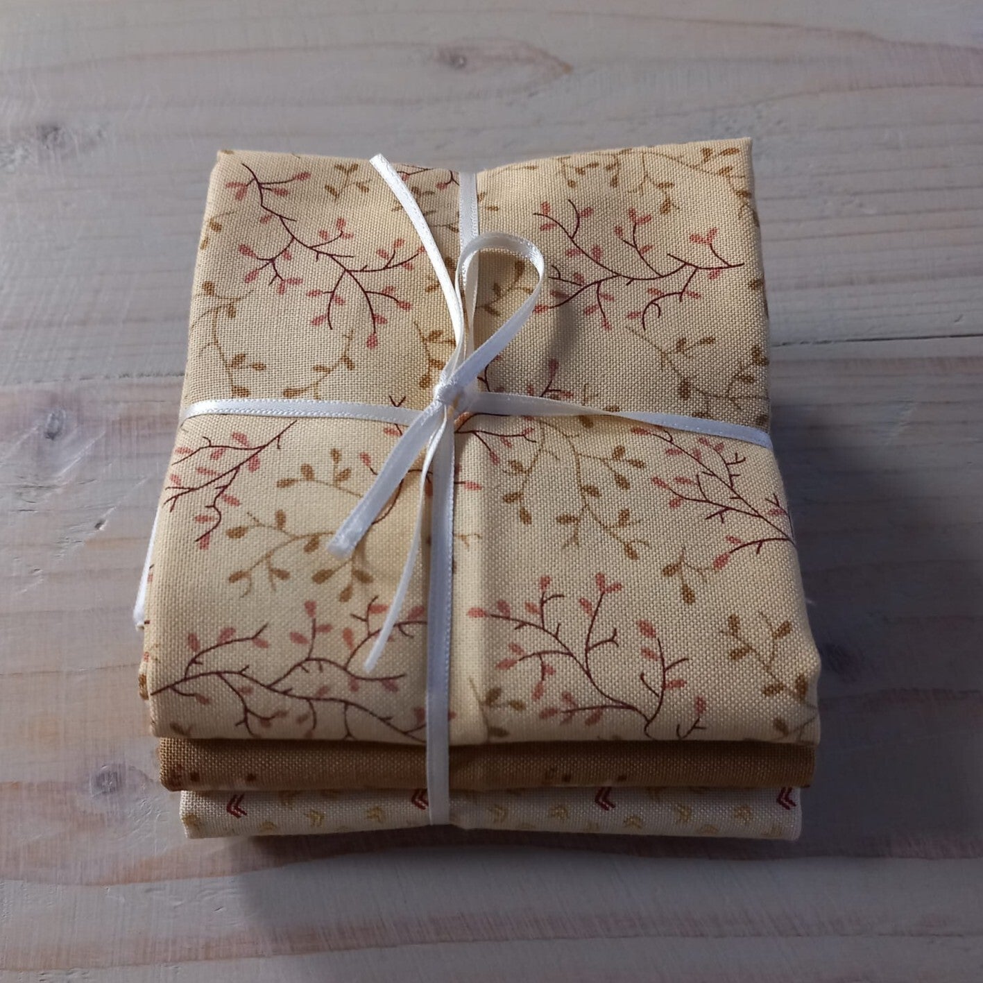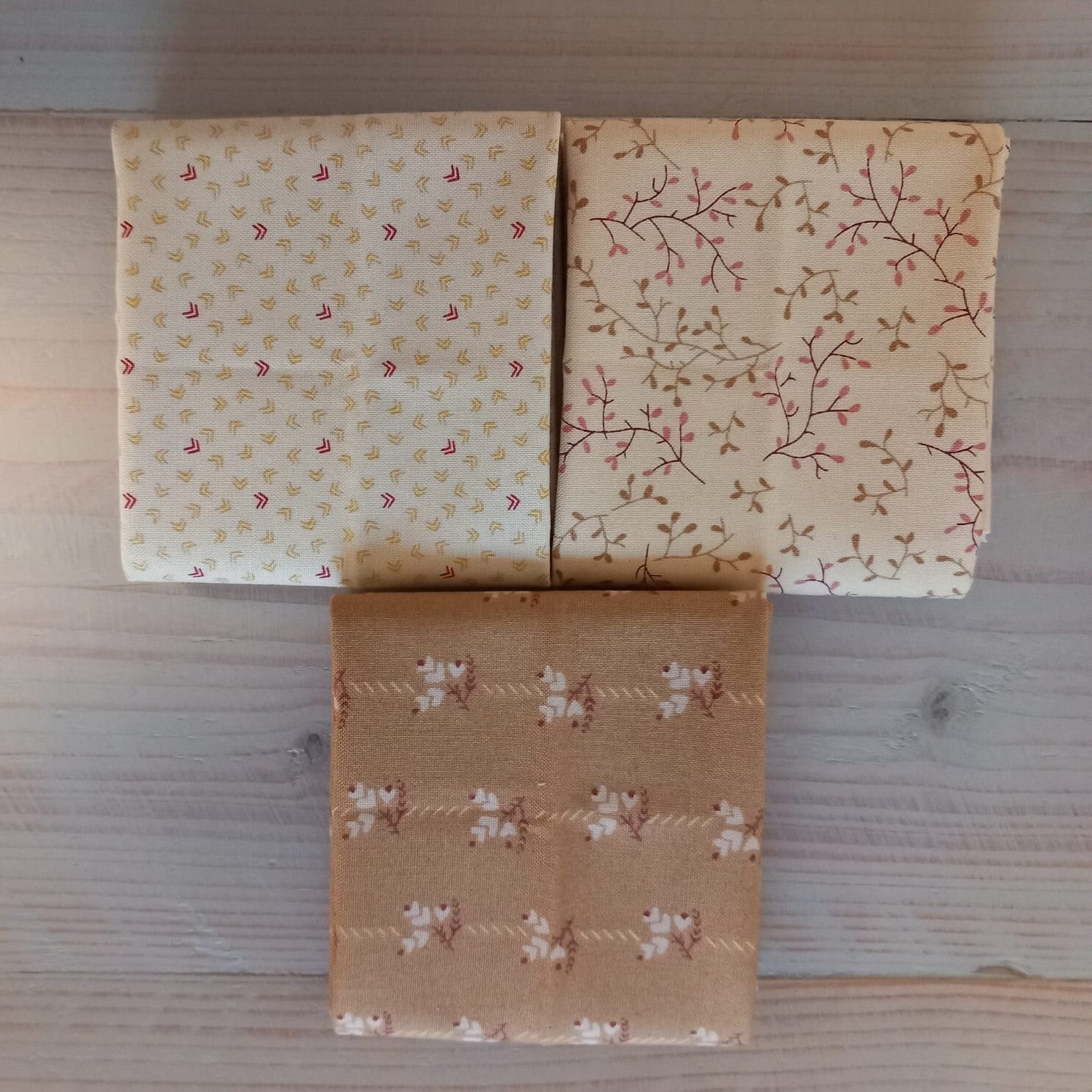 Fat quarter bundel met drie beige / bruine stoffen van Ellie's Quiltplace. De laatste fat quarters van de serie, dus nu in de aanbieding!