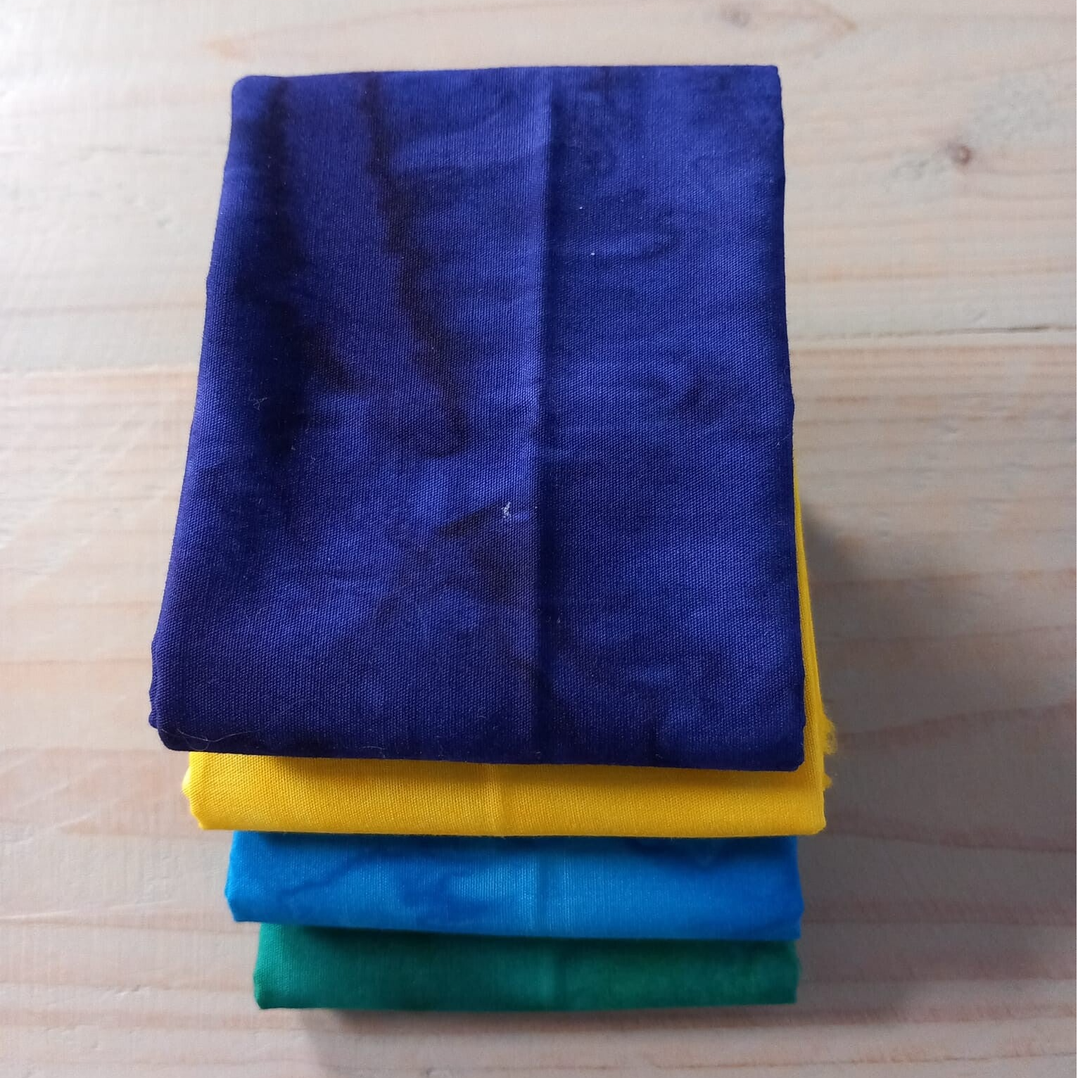Een mooie bundel van vier effen fat quarters in de kleuren blauw, groen en geel.