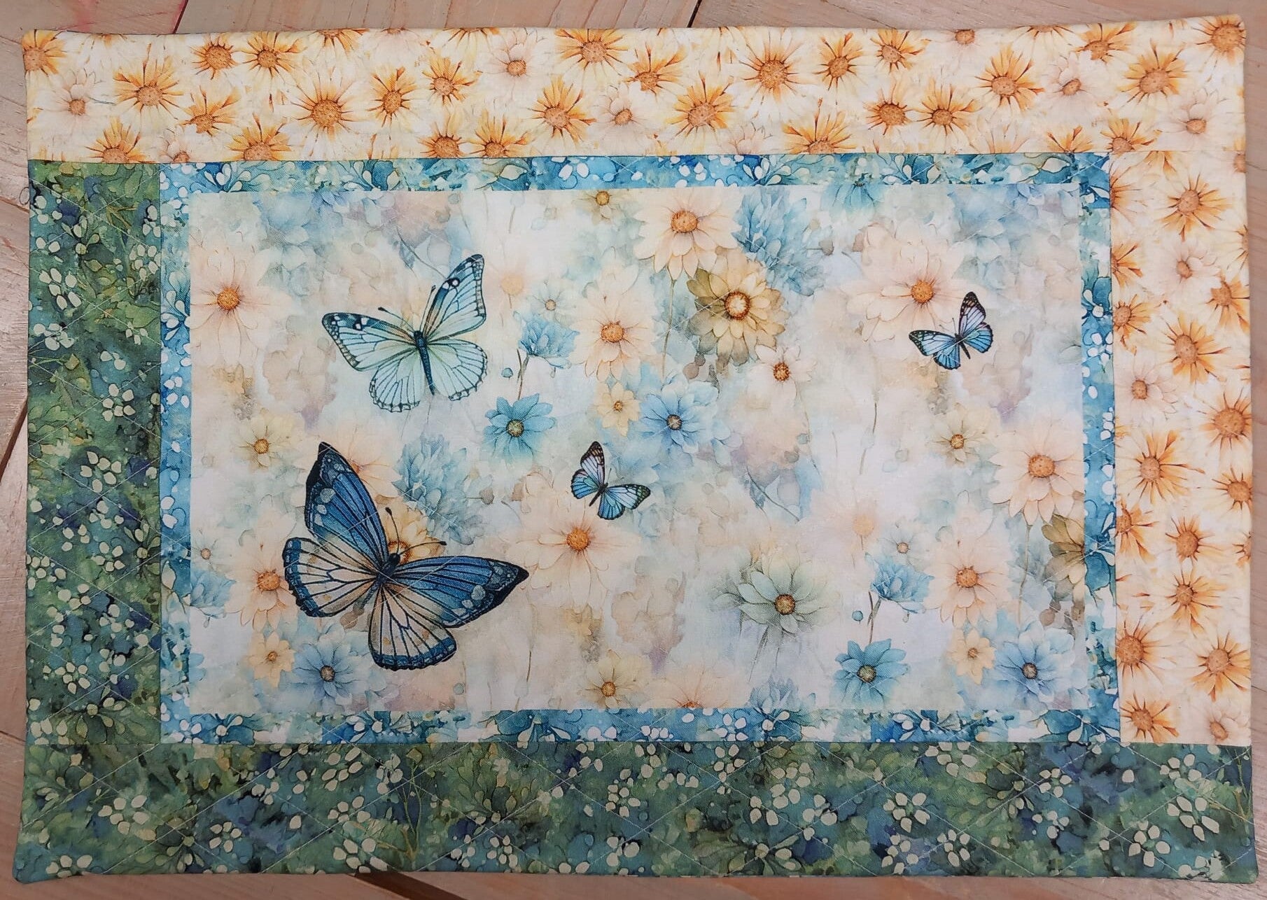 Dit pakket bevat stof en een instructie voor 2 placemats, gemaakt van de stof uit de serie Forest Whisper. De afmeting van de placemat is 33 x 48 cm. Er zijn 2 verschillende panels gebruikt voor dit pakket, sommige pakketten hebben de bloemenpanel en andere zijn gemaakt met het vlinderpanel. Er zit geen vulling voor de placemats. Hiervoor adviseer ik de Vlieseline - Thermolam - 90 cm, hier heb je 55 cm. van nodig.