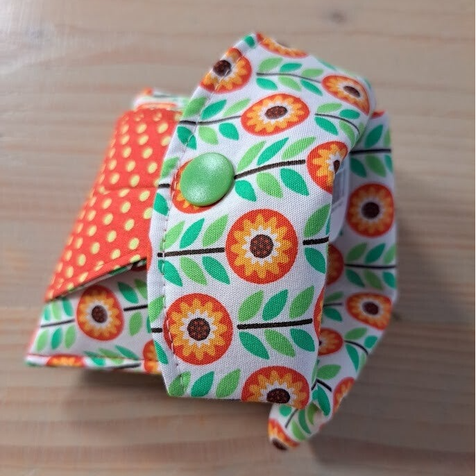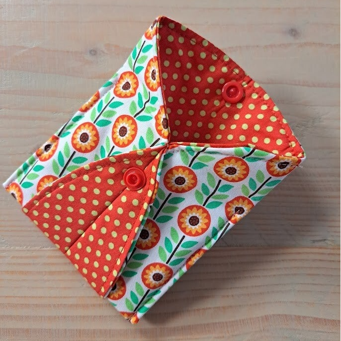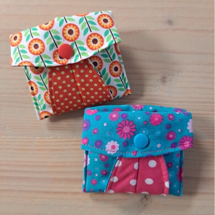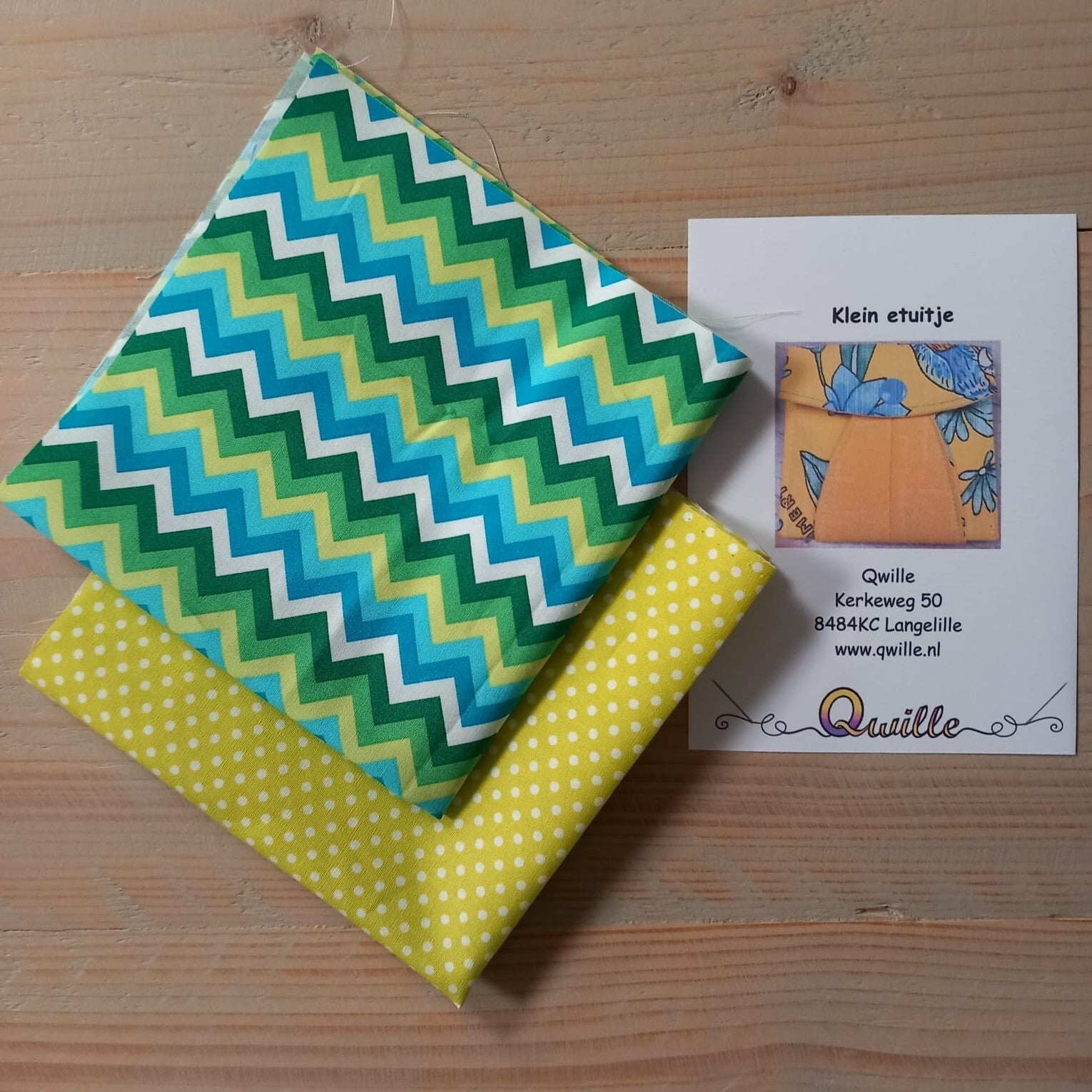 Een leuk klein etuitje om wat kleingeld, sieraden of andere kleine dingetjes in op te bergen. Het heeft 3 vakjes, waarvan er 2 gesloten worden met een drukknoop. Het formaatje van het etuitje is ca. 10 cm. breed en 9 cm. hoog. Het is eenvoudig om te maken. In het pakket zit de benodigde stof, de drukknopen en een instructie hoe het etuitje te maken is.