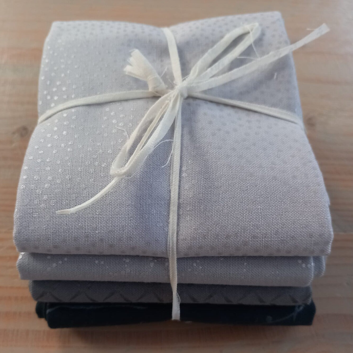 Vier fat quarters in de kleuren grijs en zwart.