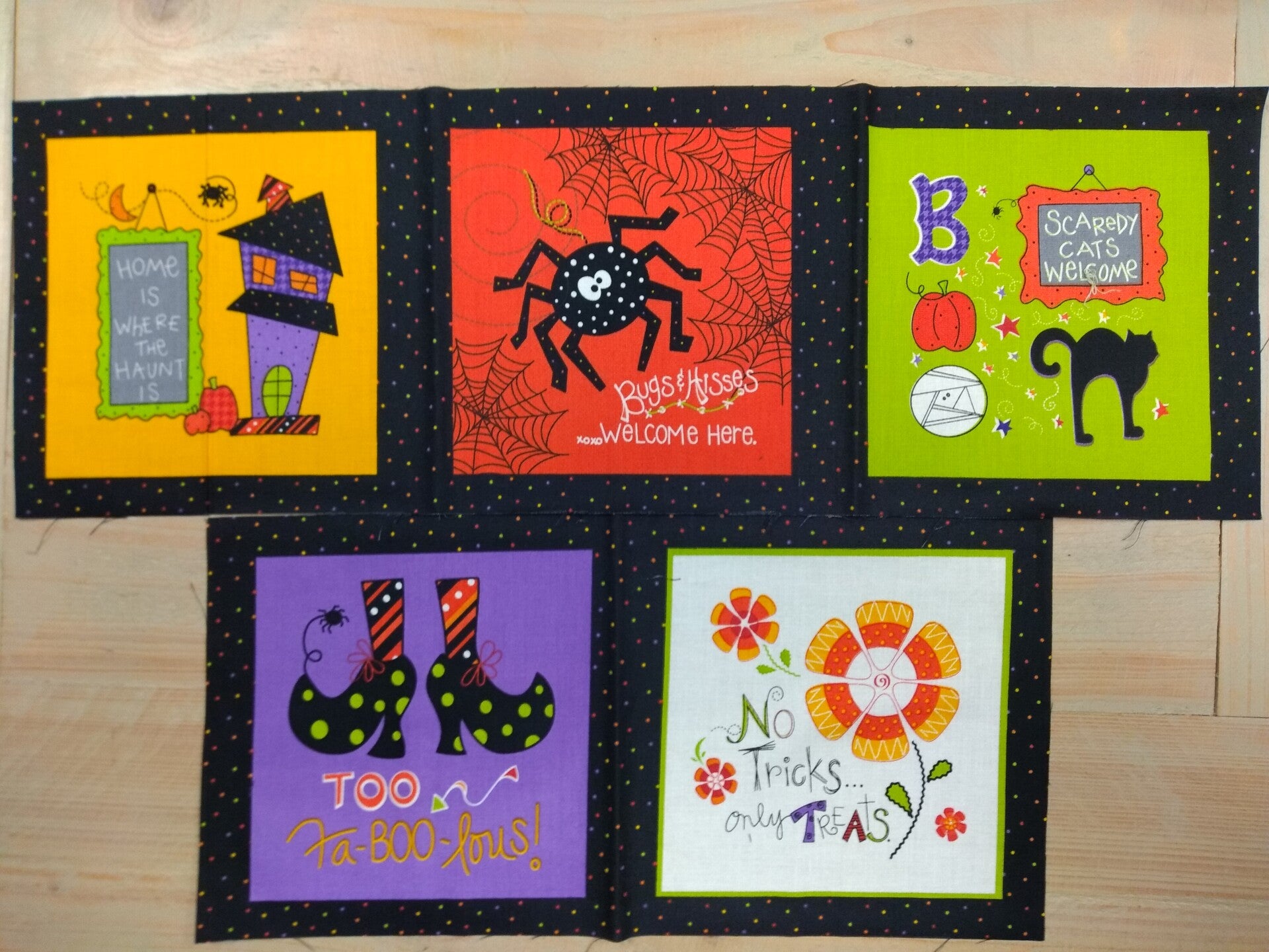 5 Grappige panels met Halloween afbeeldingen. Elk panel meet 18 x 18 cm. Leuk om tijdens Halloween je huis in de juiste sfeer te brengen met een halloween quilt of er accessoires van te maken.