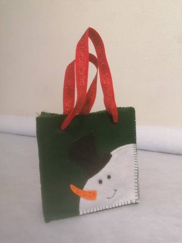 Vilten tasje met sneeuwpop van ca. 15 cm x 15 cm. Het tasje is in een rode en een groene variant te verkrijgen.