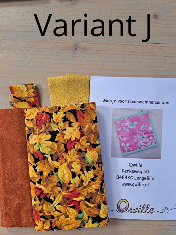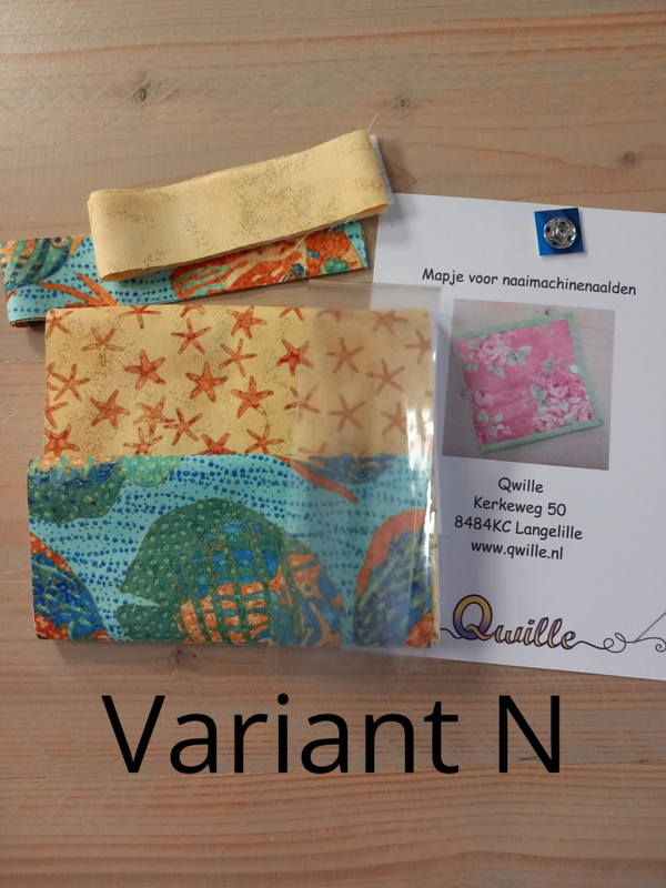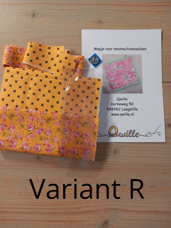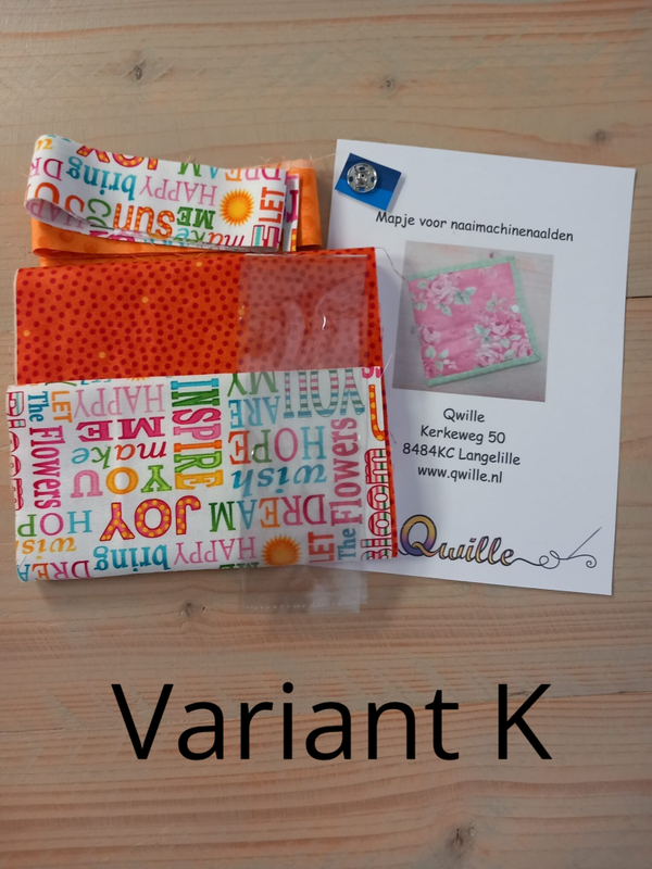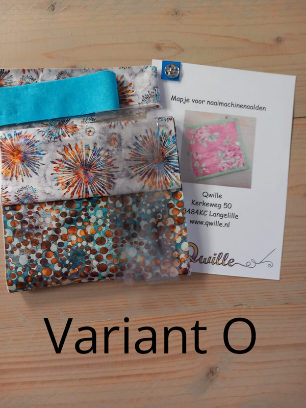 Dit pakketje bevat de stof voor de buiten- en binnenkant (zoals te zien op de variant-foto's), volumevlies, 2 plastic stroken, stof voor de bies en een drukknoop. En uiteraard een beschrijving incl. foto's om het mapje te kunnen maken.