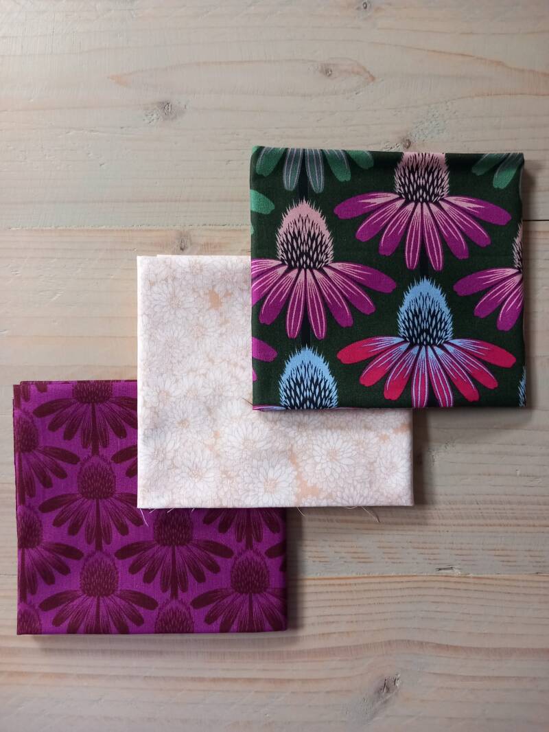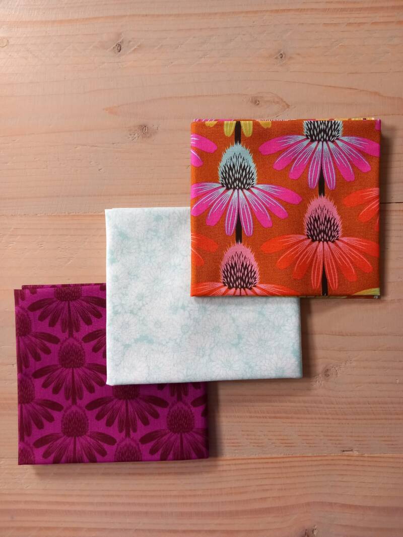 Deze kleurrijke quiltstoffen vormen een vrolijke en harmonieuze collectie die meteen uitnodigt tot creatief werken. De stapels stof tonen grote, expressieve bloemenprints in heldere tinten zoals oranje, roze, turquoise en paars.