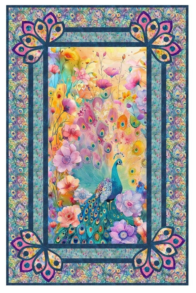 Deze serie bevat 1 panel en 9 bijpassende stoffen. Van dessins van pauwen, pauwveren en bloemen tot effen paars en gemêleerd geel/roze.